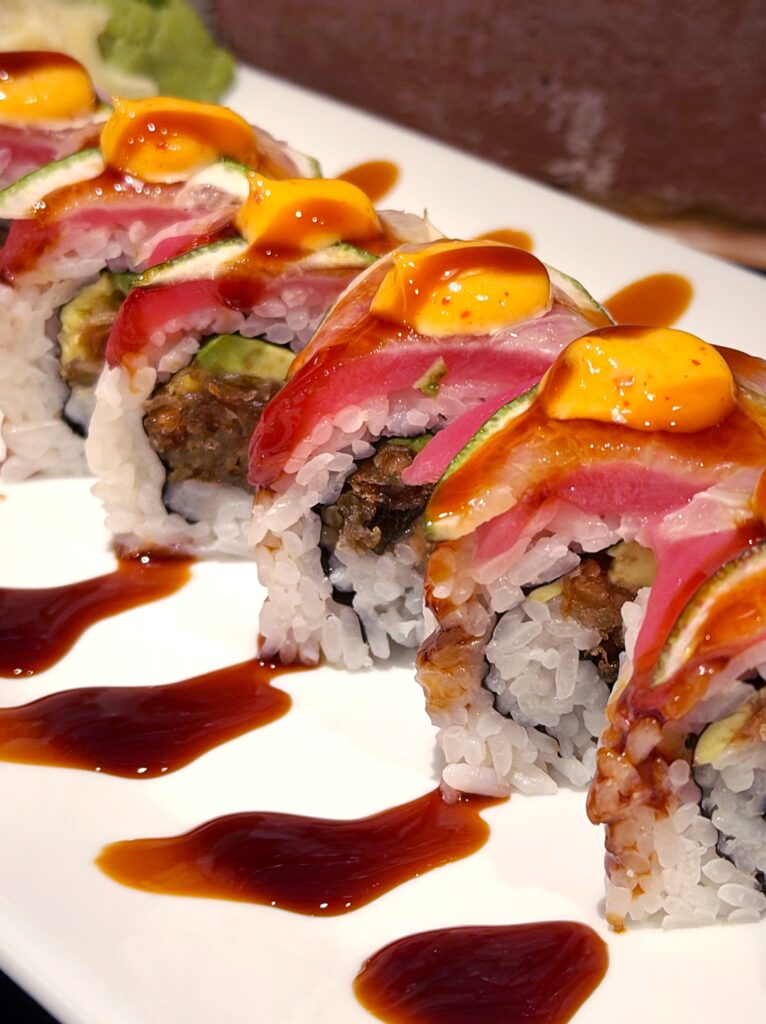 Unagi tempura, cream cheese, avocado, & jalapeño inside. Red tuna & thinly sliced lime outside. Drizzled with spicy mayo & unagi sauce.